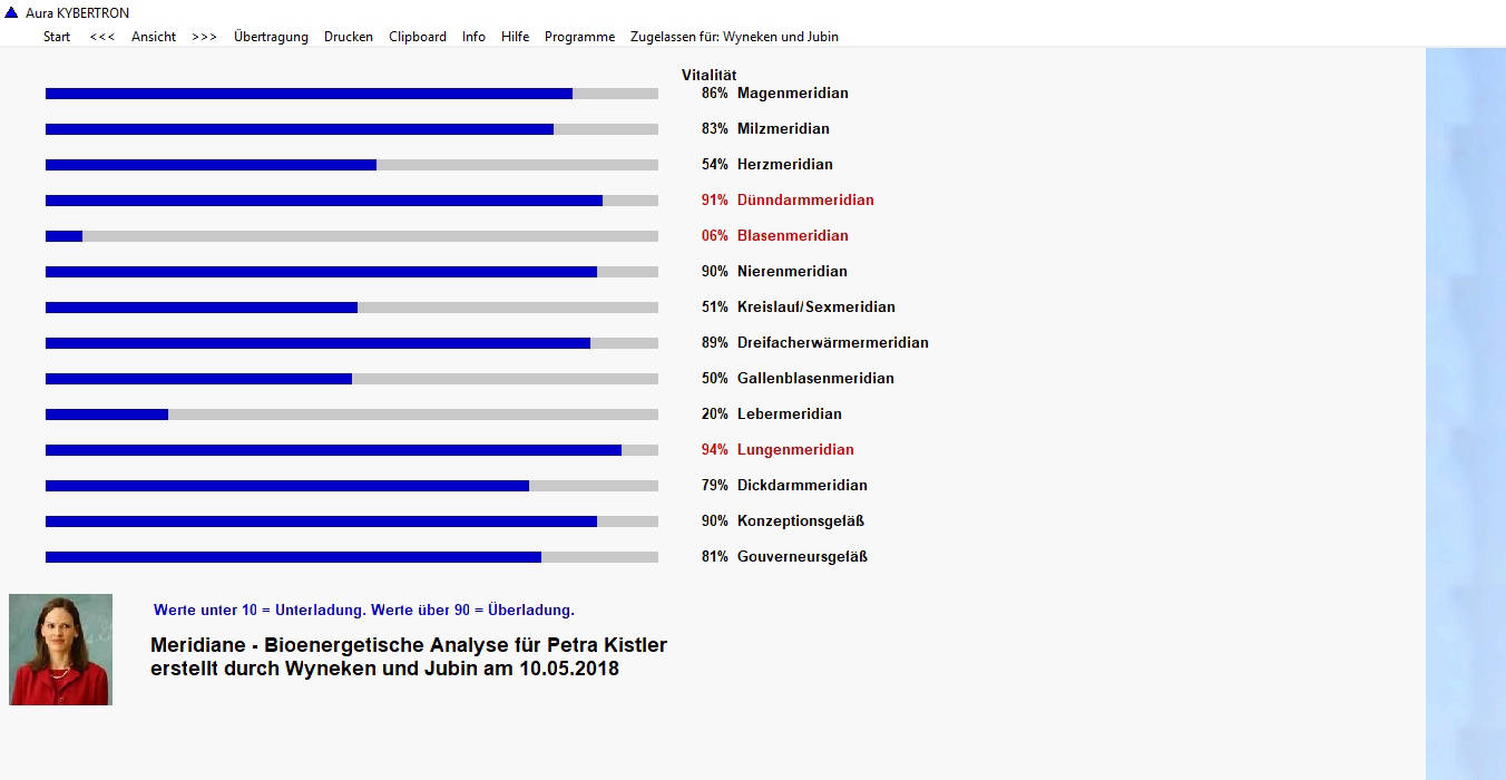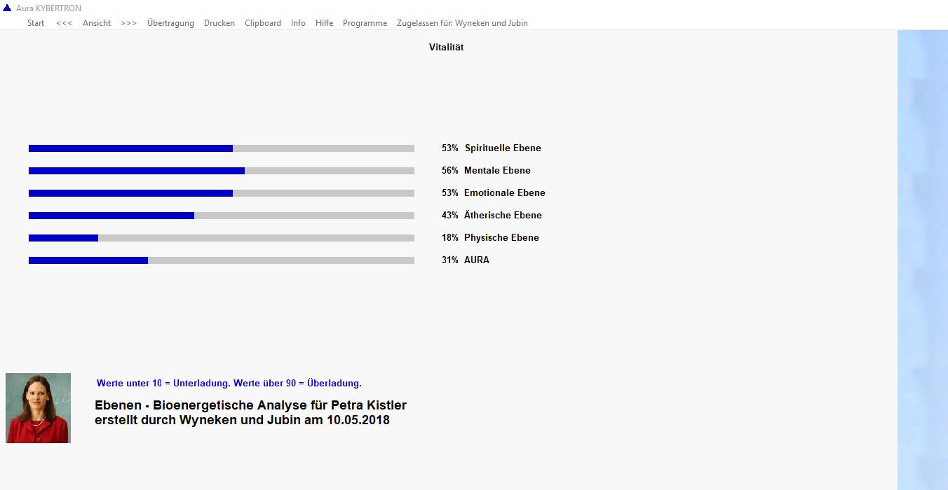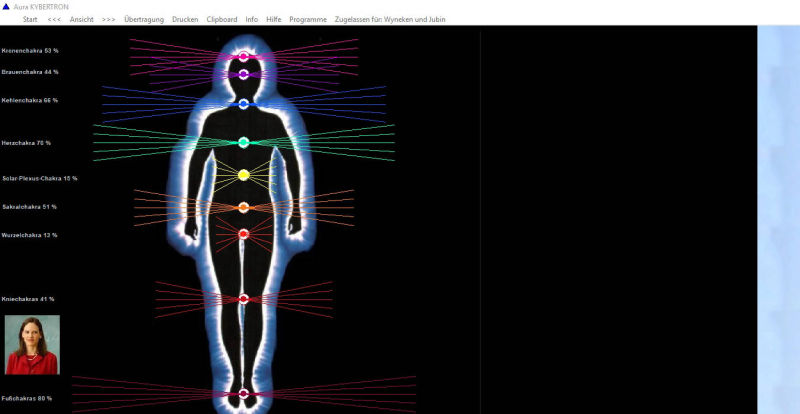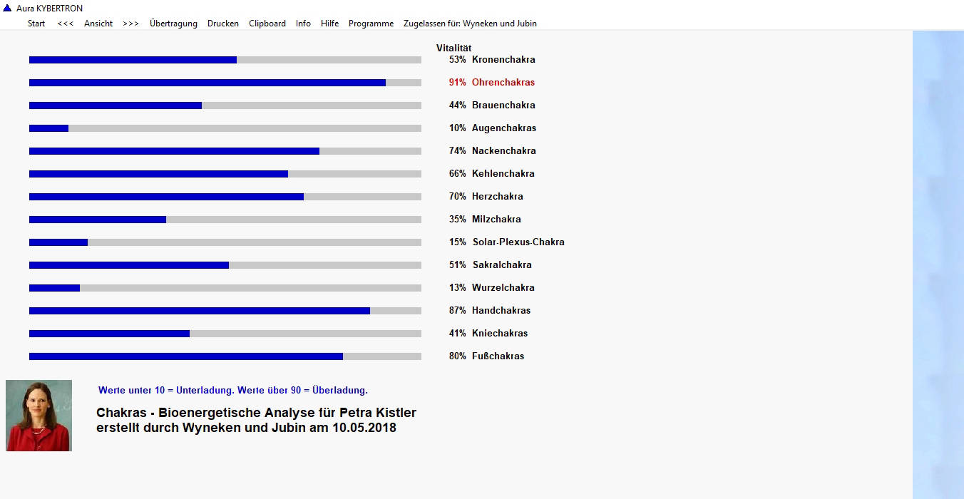 Die Grafiken und die Ergebnisse der Analyse können Sie ausdrucken, speichern und exportieren. Bei der Übertragung werden Meridiane, Chakras und Auraebenen mit Vitalitätswerten unter 10 und über 90 balanciert.
