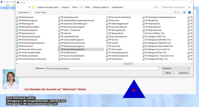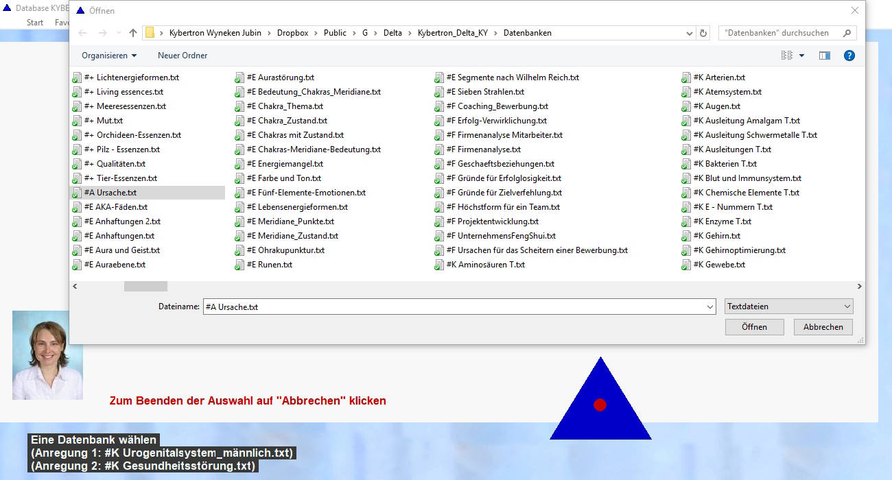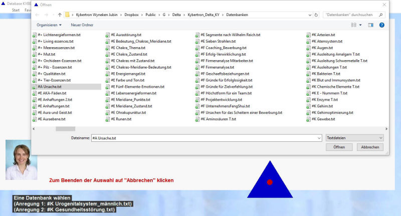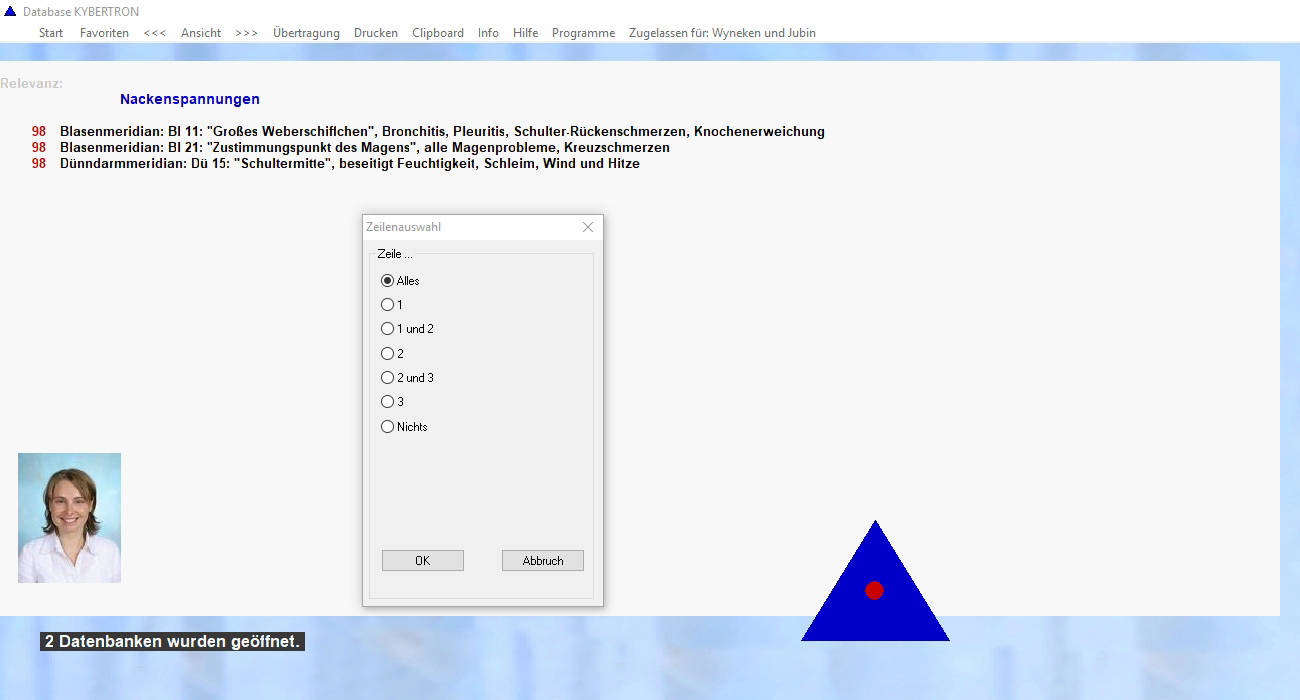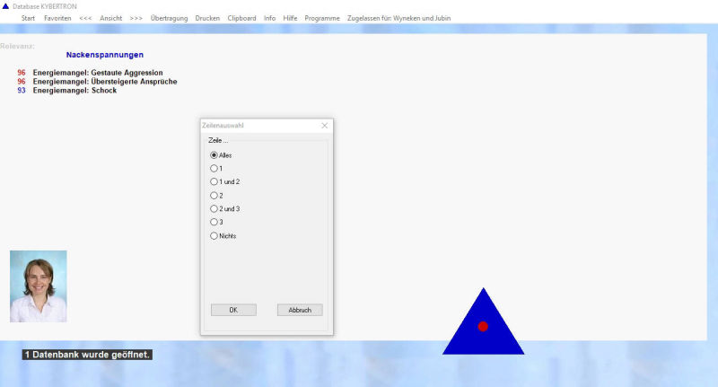 Beim Database-Programm geben Sie ein Thema (z.B. ein Symptom) ein und wählen Datenbanken aus. Beispiele: Ursachen, Meridianpunkte, toxische Stoffe, geopathische Belastungen, Körper, Psyche, Charakteranalyse, Störungsarten, Stressprofil, Firmenanalyse, verschiedene Mittel, Qualitäten und vieles mehr. Das Programm zeigt drei Ergebnisse aus der betreffenden Datenbank in der Reihenfolge der Relevanz an.