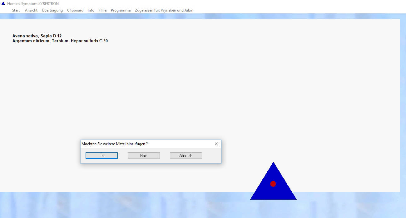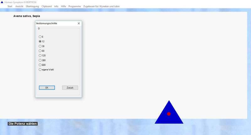 Diese können Sie übernehmen und weitere Symptome hinzufügen. Sie wählen die Potenz (die Verdünnung und die Verdünnungsschritte). Die Schwingung der Mittel kann direkt zur Person oder auf Transmitter (z.B. Wasser, Tropffläschchen, Globuli oder Objekte) übertragen werden.