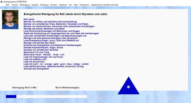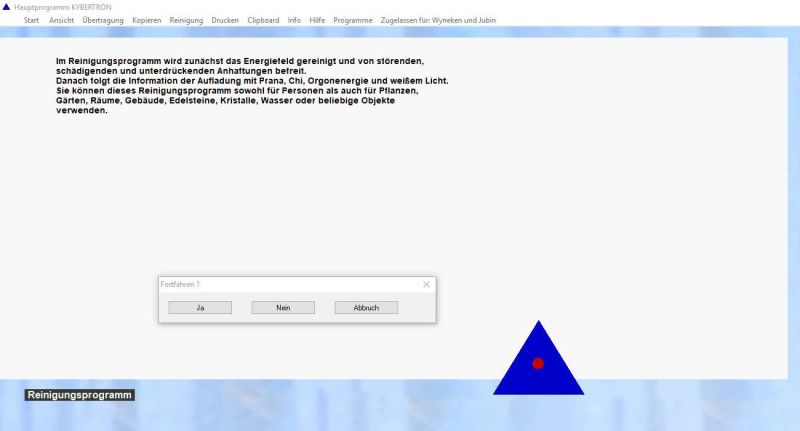 Es folgt ein wünschenswertes Ziel oder eine Affirmation Ihrer Wahl. Das Reinigungsprogramm ermöglicht die bioenergetische Information und Aktivierung von Personen, Tieren, Steinen, Kristallen, Edelsteinen, Räumen, Gebäuden, Pflanzen, Feldern, Wasser oder anderen Objekten.