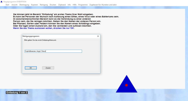 Beim Reinigungsprogramm geben Sie zuerst ein Entladungsthema Ihrer Wahl ein. Das kann ein Gift, eine allergische Reaktion, ein störendes Gefühl (”Kofschmerzen”, “Stress”), ein Glaubenssatz oder der Name einer Person sein, mit der Sie gerade Schwierigkeiten haben. Sie können auch ein zweites Entladungsthema einfügen.